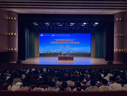原图书馆馆长、正高级研究馆员吴海峰老师于文化路千人大礼堂为学院2025级新生作“我和我的农大”——新生成长成才报告会。院团委副书记郭潇、2025级新生辅导员李艳飞及2025级全体新生参加报告会,报告会由郭潇主持。