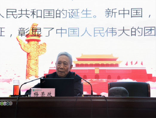 梅荣政从“创建中华人民共和国的革命,是近代中国社会主要矛盾及其激化的必然结果”、“中华人民共和国的诞生,是中国人民戮力同心、共同坚持长期斗争的胜利成果”、“中华人民共和国的诞生,证明没有共产党就没有新中国”、“中华人民共和国的诞生,证明了资产阶级的共和国在中国行不通”铁一般的事实证明了中国人民所确认的客观真理;从“确保中国选择社会主义道路、为实现社会主义工业化提供了政治制度基础、为确保共产党的领导和执政提供了国家权力支撑”阐释了新中国成立的伟大意义。梅荣政思考深刻、视野广阔、观点鲜明、材料丰富,以马克思主义学者的优秀学养让在场师生折服,为大家带来一场深刻、精彩的党课,指导大家更好地学好国史、党史,更加坚定共产主义远大理想和中国特色社会主义共同理想,不忘初心、牢记使命,增强“四个意识”,坚定“四个自信”,做到“两个维护”,为实现中华民族伟大复兴而努力奋斗!报告会结束后,王红艳代表师生向梅教授提出了“作为思想政治教育工作者,尤其是从不同学科背景汇聚而来的思想政治教育工作者以及青年学生,应该如何学习马克思主义”的问题。梅教授从“读、思、悟、坚”四个方面耐心地解答,他指出学习要联系实际,联系所学知识,久久为功,一定会取得成功。