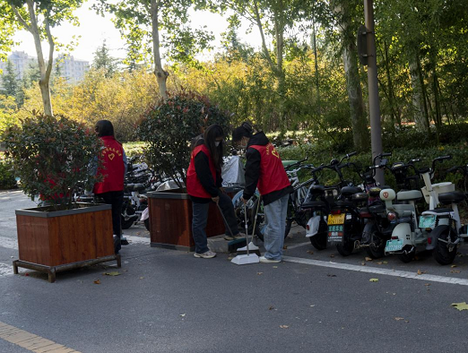车辆摆放小队将宿舍楼前两侧的电动车移动到指定停车位置,停放整齐有序,避免造成交通拥堵和占用安全通道,并向过往的同学强调文明停车的重要性,引导同学们养成良好的停车习惯,倡导大家自觉遵守停车规则,共同维护校园交通秩序。