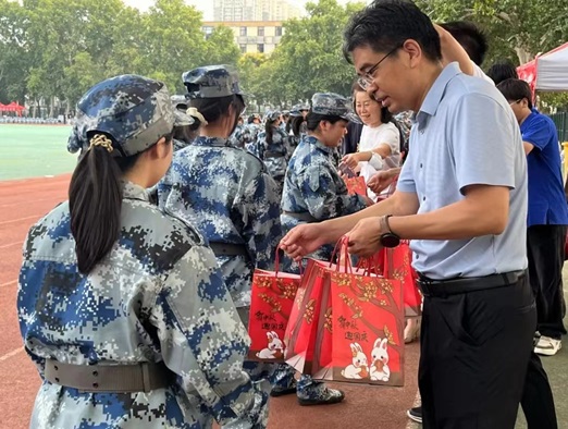 随后,院党委书记苏楠与同学们进行了亲切交流,对同学们昂扬向上的精神状态和整齐划一的出色表现给予了高度赞扬同时,也代表学院送上了节日的祝福。紧接着,学院领导为同学们送上精美的月饼,希望能够为他们度过一个特殊且难忘的中秋节。