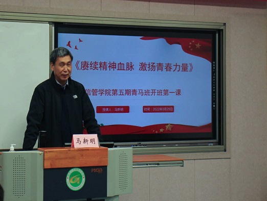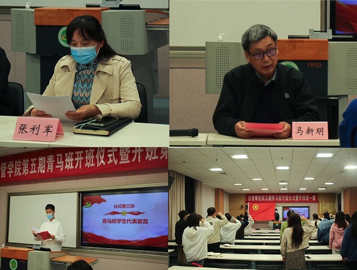 第五期青马培训班学员培养实施方案》,从理论学习、红色教育、课题研究、实践锻炼和志愿服务五个方面培训内容和相关纪律要求做了详细讲述。接着,青马班班长关高帅同学发言,他代表全体学员做出五点承诺,号召大家潜心学习马克思主义理论,争做高素养青年马克思主义者。随后,马新明作开班讲话并对学员提出三点希望:希望学员们要肩负使命,传承红色基因;要深入学习,实现知行合一;要紧跟时代,做到学以致用。最后,第五期青马班全体学员面向团旗重温入团誓词。