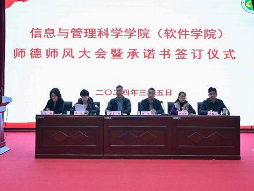 本网讯(通讯员 郭潇图片陈康飞)树师表,正师风,铸师魂。为认真学习贯彻习近平总书记关于教育的重要论述,落实立德树人根本任务,进一步加强师德师风建设,打造作风过硬、师德高尚的教师队伍。3月5日,学院在龙子湖校区召开师德师风教育暨承诺书签订大会。院领导班子成员、学院全体教职工参加会议。会议由院党委副书记蔡镔主持。