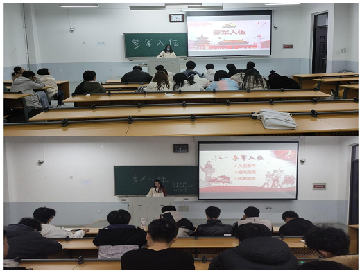 各学生班于龙子湖校区D座教学楼开展“应征入伍,保家卫国”专题教育活动。学院全体同学积极参与本次活动。