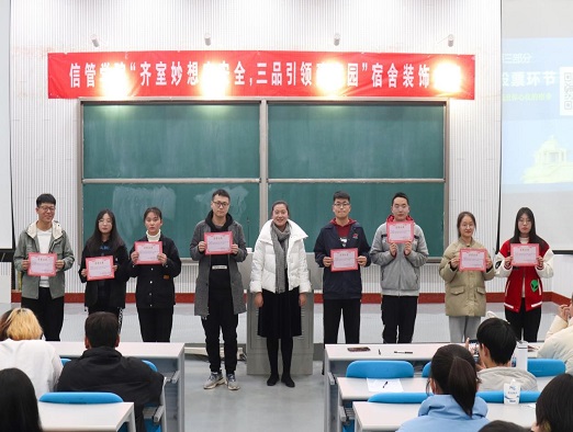 于龙子湖校区教学楼大教室2举办“齐室妙想守安全,三品引领建家园”主题宿舍装饰大赛。2021级年级辅导员李艳飞出席比赛,各2021级助理班主任、新生同学代表及优秀宿舍代表参加本次比赛。