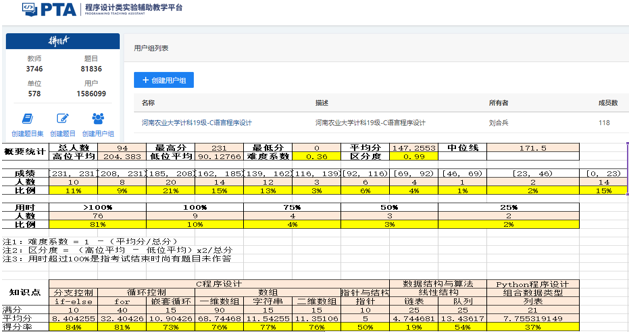 目前,计算机科学与技术专业19级(C语言程序设计课程)、18级(算法设计与分析课程)在上述平台创建了对应的教学课堂,并进行了课程实践练习。